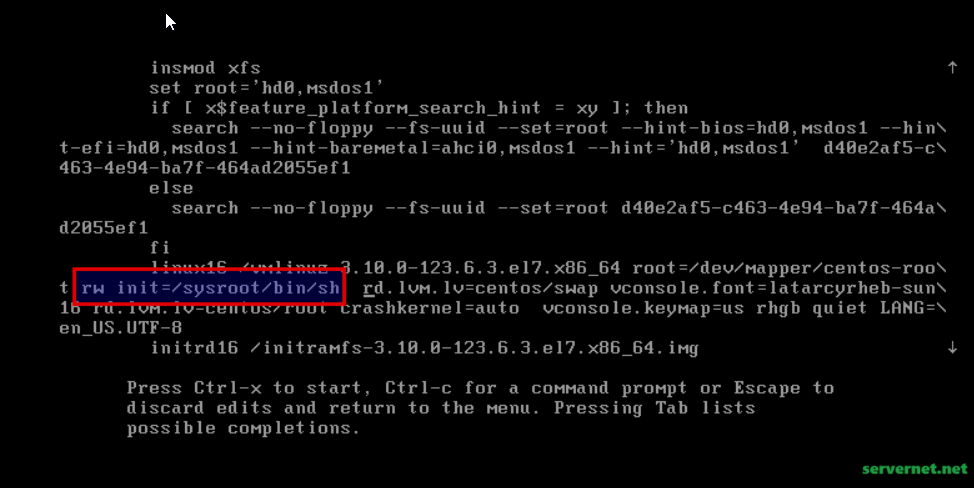 In the editing mode, locate the “kernel” line, which usually starts with “linux” or “linux16.” Once you find this line, change “ro” (read-only) to “rw” (read-write). After rw add init=/sysroot/bin/sh